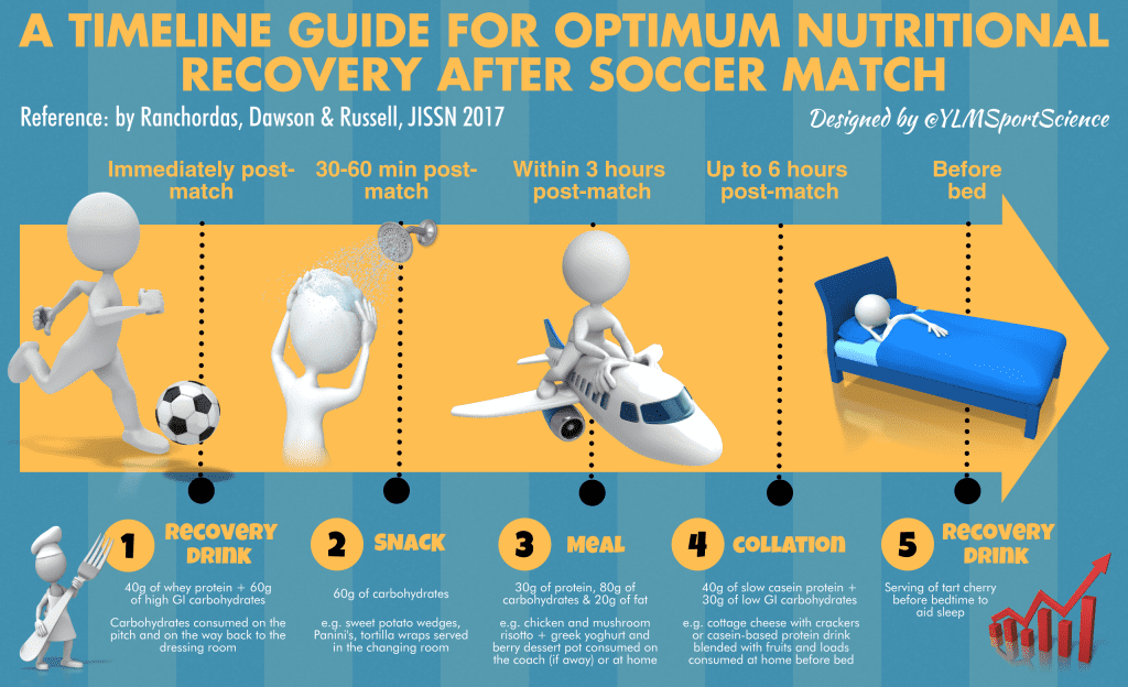 Immediately post match consume simple carbohydrates (high glycemic index) to begin replenishing glycogen store such as carbohydrate electrolyte drinks, gels, cereal bars, fruit